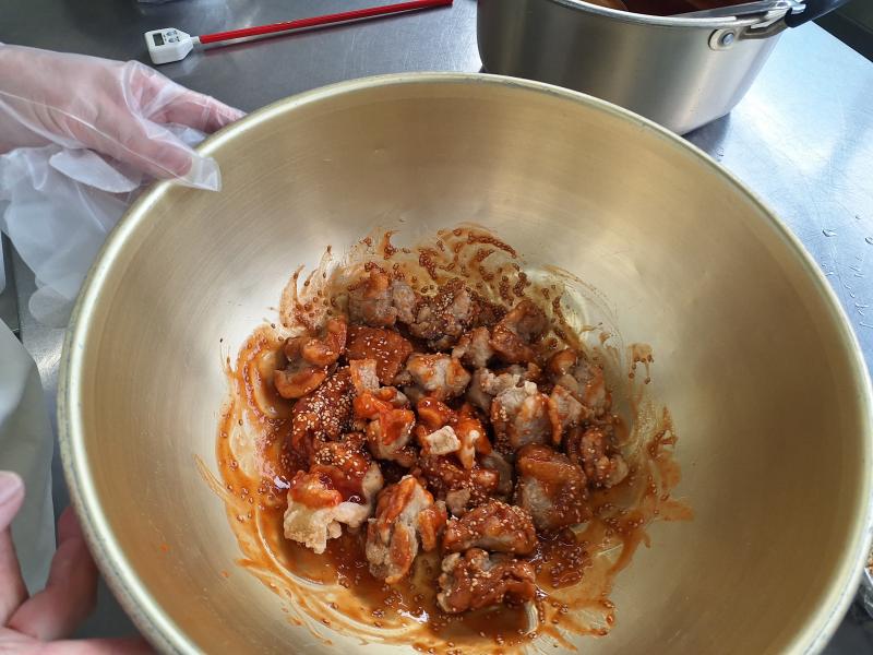 ☆揚げた鶏肉にヤンニョムソースをからめています