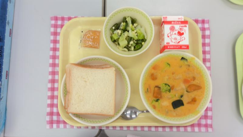 今日はパンの日です。食パンとも相性ぴったりなシチューをつくりました。今日はじゃがいもの代わりにかぼちゃを使ったパンプキンシチューです。見た目もとてもあざやかな1品になりました