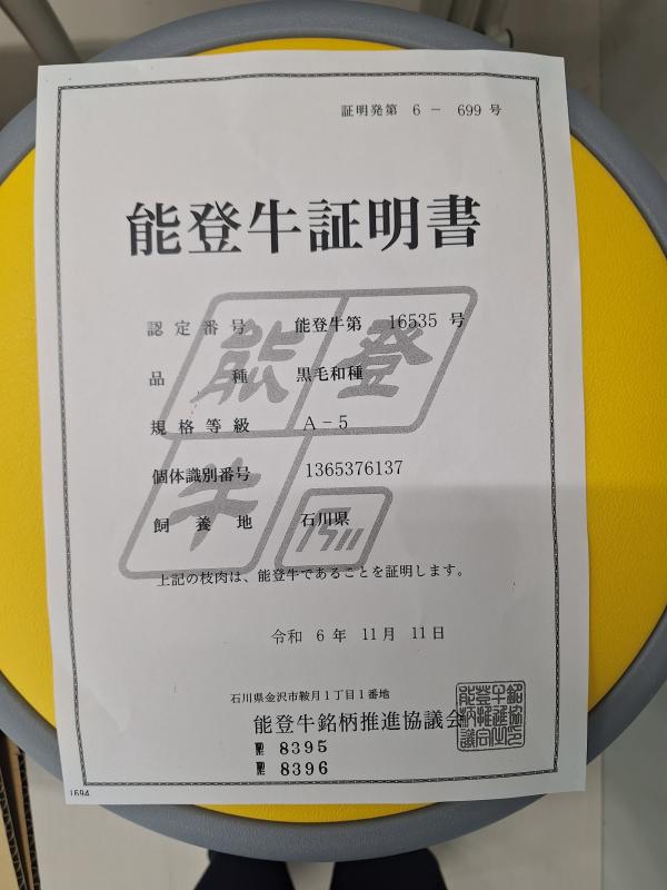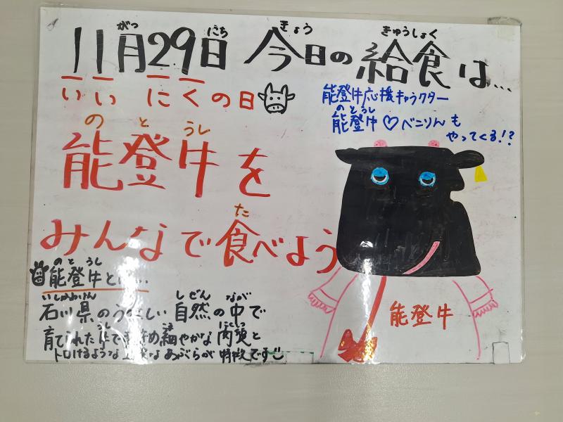 今日はいい肉の日ということで能登町より、給食に「能登牛」の無償提供をいただきました。お肉はA5ランクの能登牛でしっかり証明書も一緒にいただきました。肉と脂のバランスがとてもよく、見た目もとても美しいお肉でした。