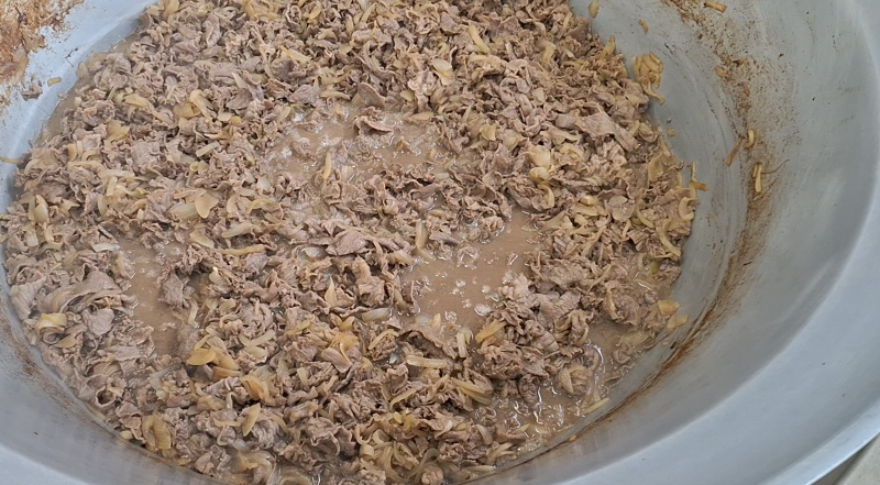 そんな能登牛と、能登町内でとれた玉ねぎと、能登町産米で今年も牛丼を作りました。能登牛は肉の味やわらかさを楽しめるように半分は最初の炒めから、残り半分は後半の煮込みの工程からの2回に分けて加熱しました。最後にしょうがもいれて肉の脂の味を最後まで楽しめる味付けにしました。