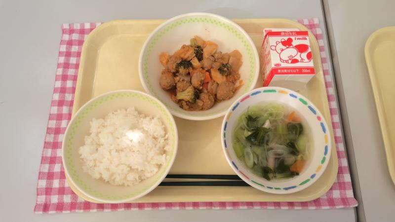 ごはん 肉団子の甘酢がらめ 糀スープ 牛乳