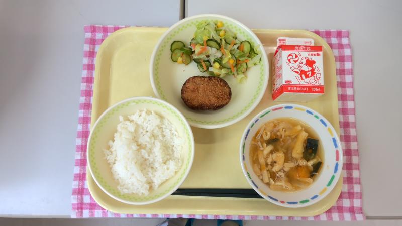 ごはん(天日塩入り) コロッケ コーンサラダ みそ汁 牛乳