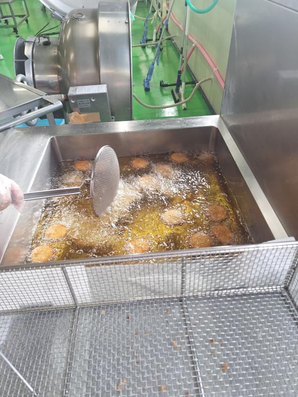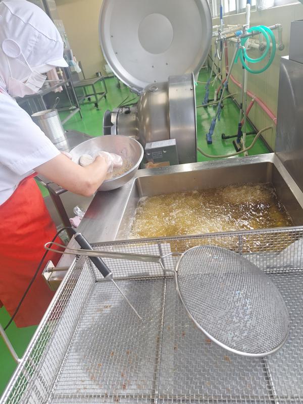 給食ではいろいろな揚げ物がでてきますが、コロッケは揚げるのが難しい料理のひとつです。油の温度をよく確認しながら、コロッケを油にいれる量を調整して、破裂しないように丁寧に揚げてくださいました