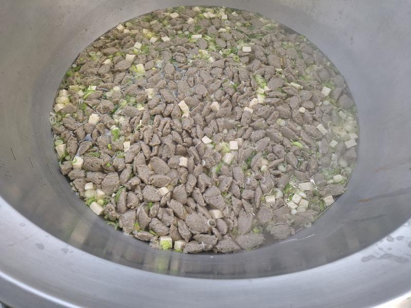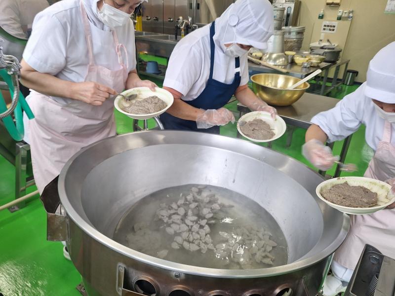 今月のおさかな給食でもあるめぎすのつみれ汁にはこんぶでだしをとった後にめぎすのすり身をスプーンですくいながらひとつひとつ釜にいれていきました。酒と塩をいれて煮ることでめぎすの味が釜全体に広がります