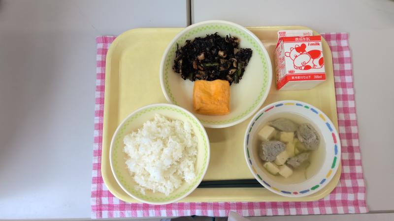 ごはん 厚焼きたまご ひじきの炒め煮 めぎすのつみれ汁 牛乳