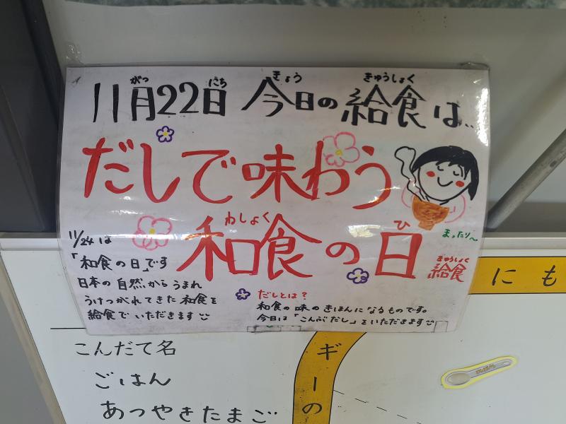 11/24には「いい日本食」の語呂合わせから「和食の日」です。今日は給食で和食の基本の味である「だし」を感じられる和食の給食を作りました。