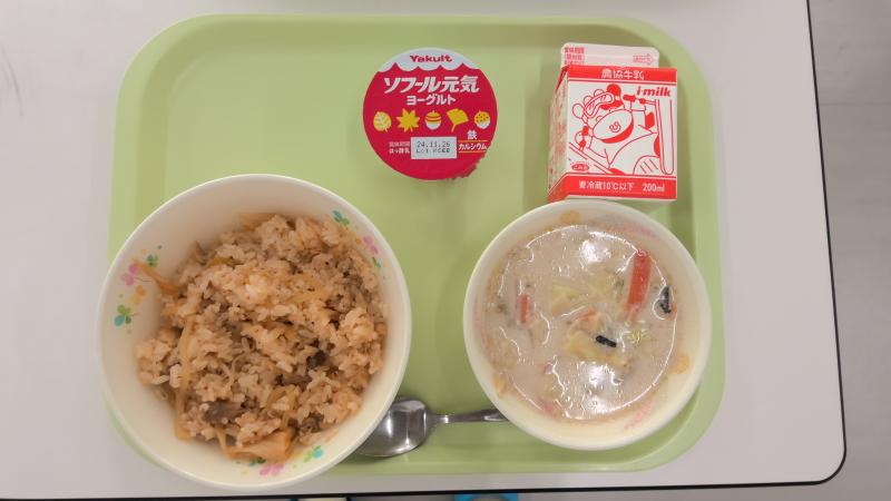 給食では野菜やかまぼこ、豚肉を中華だしやオイスターソース、牛乳と煮込んでつくってみましたいつもとは色が違うスープに食缶を開けた瞬間から子供たちが驚きながら喜んでくれました
