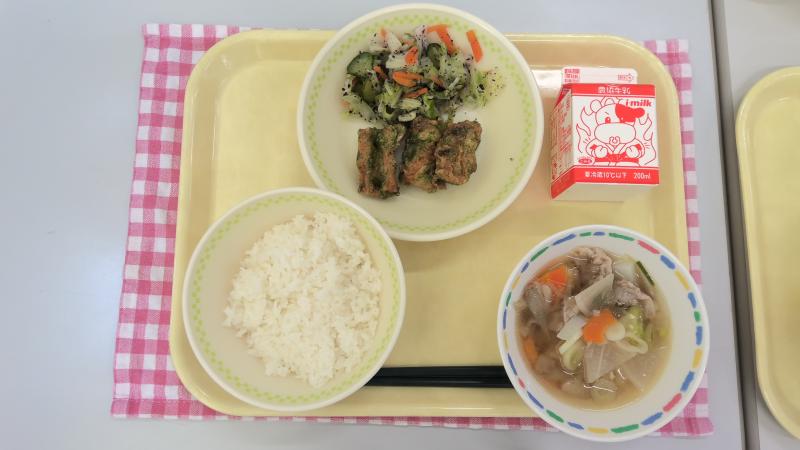 ごはん ちくわの磯部揚げ ゆかり和え 豚汁 牛乳
