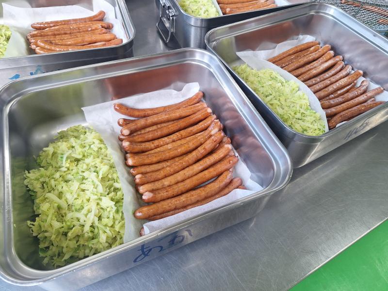 ひとつひとつ調理員さんが切り込みをいれてくれたコッペパンにウインナーとキャベツをはさんで、ケチャップをかけていただきましょう