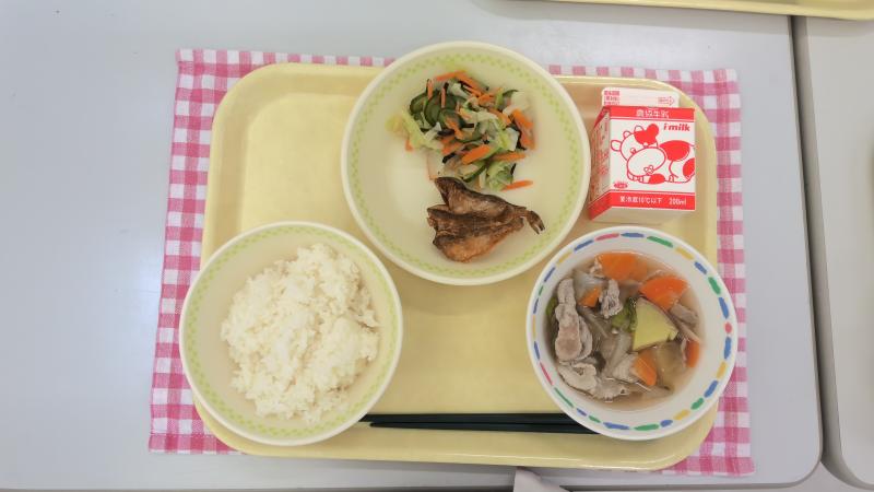 ごはん はたはたのから揚げ さざなみ和え 秋野菜豚汁 牛乳