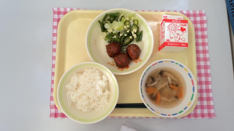 ごはん 肉団子ケチャップあん グリーンサラダ ポテトスープ 牛乳