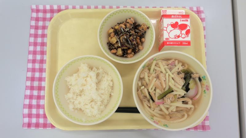 ほんのり塩ごはん きつねうどん 大豆と小魚のごまがらめ 牛乳