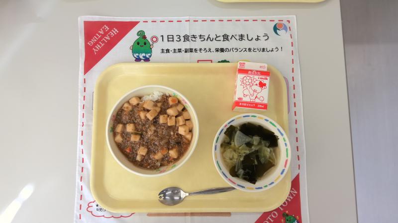 今日は麻婆豆腐丼です。いつもの給食とは違い、具をごはんにかけるスタイルの麻婆豆腐です。ごはんとも相性ぴったりなので、いっぱい食べてほしいです