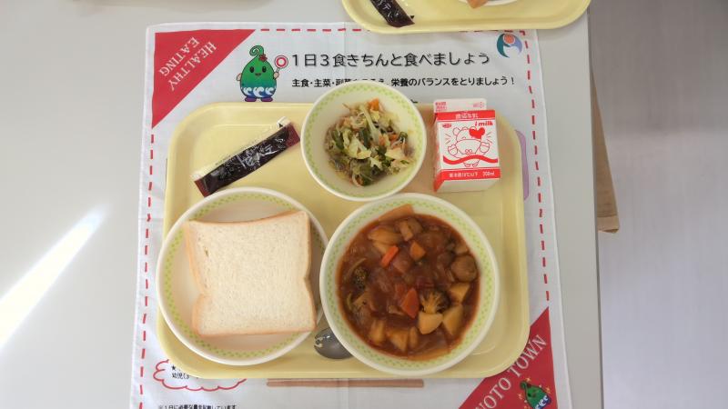 食パン チョコクリーム ミートボールシチュー 野菜ソテー 牛乳