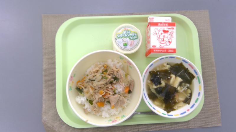 豚丼 みそ汁 メロンクリームソーダゼリー(支援物資) 牛乳
