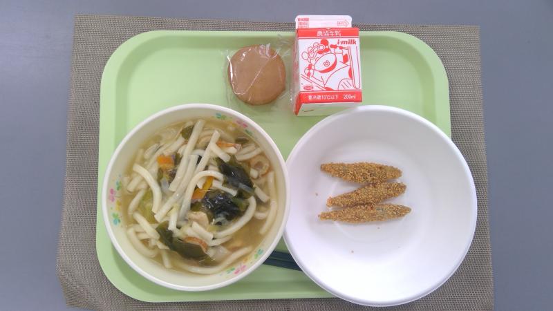 わかめうどん きびなごのカリカリフライ 今川焼き 牛乳