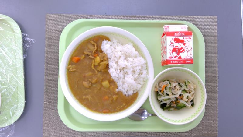 今日はみんなが大好きなカレーの日です。カレーの今日のおともはかむ力を鍛えるかみかみ和えです。かみかみ和えには切干大根、きゅうり、にんじんのシャキシャキとわかめのぐにゅぐにゅなどいろんな食感が楽しめるかみかみ和えです。30回かむことを目標にいただきましょう