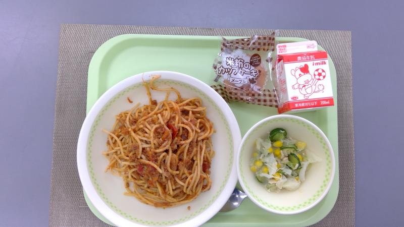 ミートスパゲッティ コーンサラダ 米粉のカップケーキ 牛乳