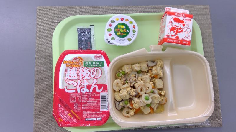 パックごはん のりの佃煮 高野豆腐の卵とじ 野菜とくだもののゼリー 牛乳