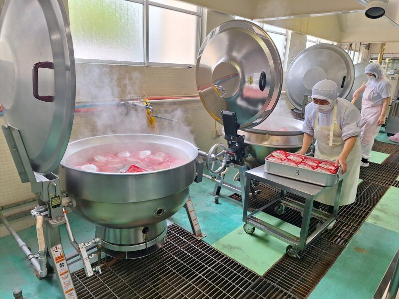 今日はスパゲティーを作りました。給食では一度に作る量が多いため、小学校・中学校、材料を分けてスパゲティーは作っています。給食室にある大きな回転釜を3つも使い一生懸命ソースを作ったり、麺をゆでたりしました。