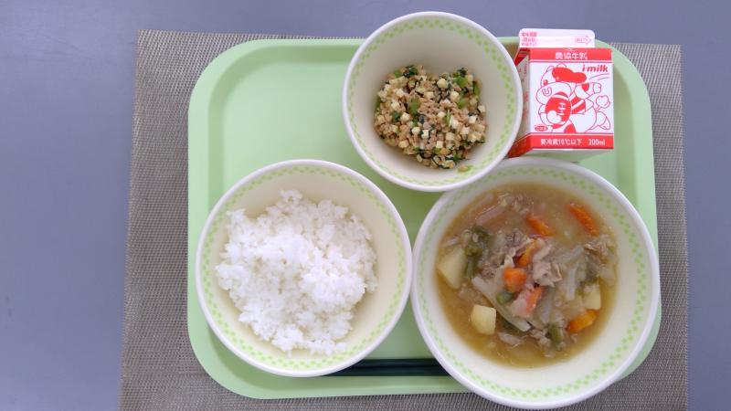 今週は歯と口の健康週間です。今週は毎日の給食で嚙み応えのある食べ物が登場しています。今日はシャキシャキ小松菜入りのチーズ納豆です。ひきわり納豆とブロックチーズの大きさにあるように小松菜を細かくきざみました。シャキシャキした食感がアクセントになっています