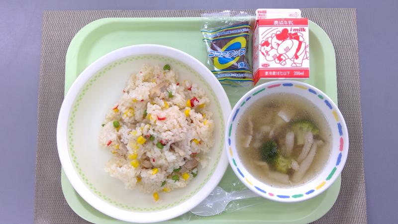 コーンピラフ ベーコンポテトスープ ココアワッフル 牛乳
