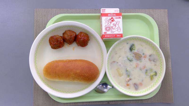 コッペパン クリームシチュー 肉団子ケチャップあん 牛乳