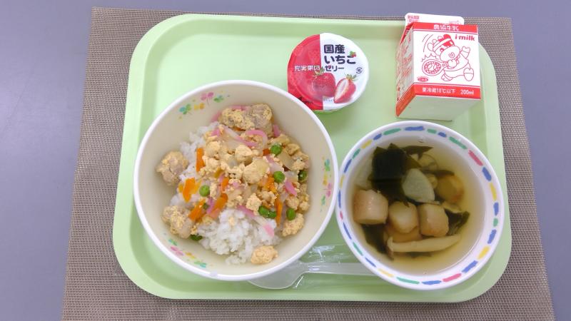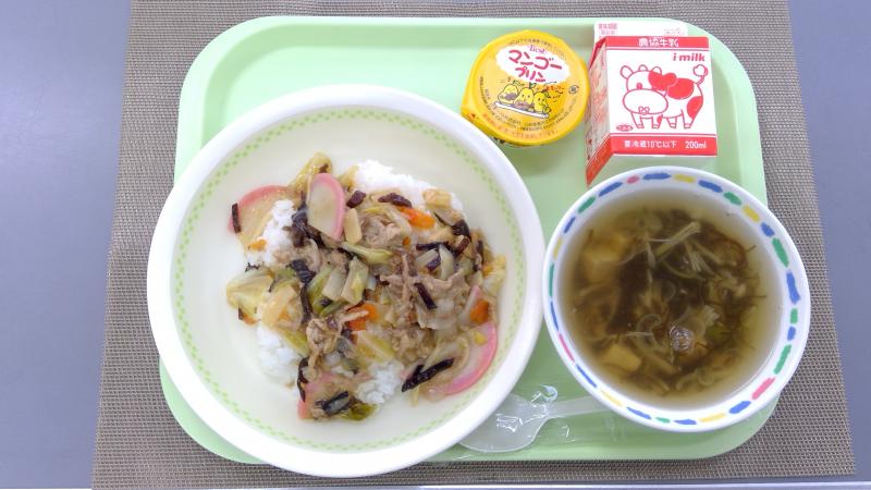 今日は中華丼をいただきました。中華丼にはキャベツ、にんじん、たまねぎ、たけのこ、きくらげとたくさんの野菜をつかいました。お肉もかまぼこもはいっているので、体をつくるたんぱく質もしっかりとれます。