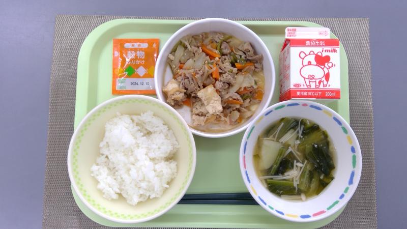 ごはん ふりかけ 豚肉と野菜の生姜炒め みそ汁 牛乳