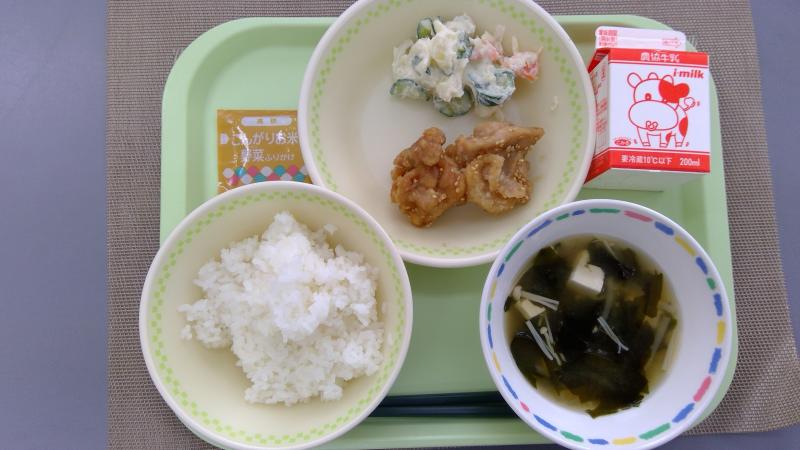 ごはん ふりかけ 鶏肉のごまがらめ ポテトサラダ みそ汁 牛乳