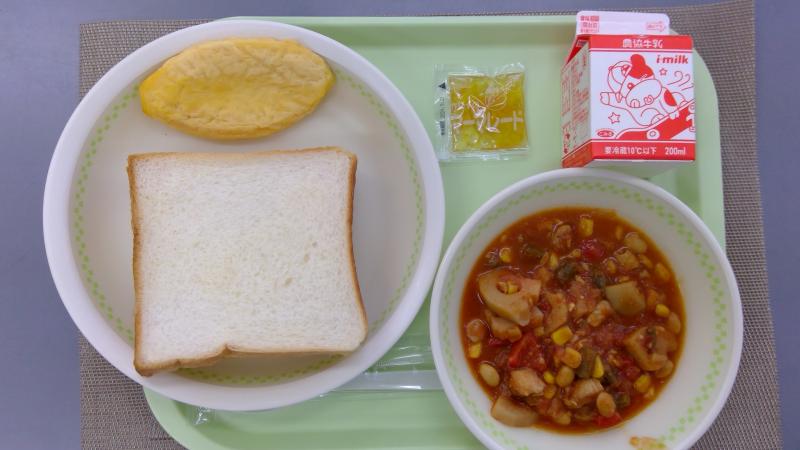 食パン マーマレードジャム チキンのトマト煮込み オムレツ 牛乳