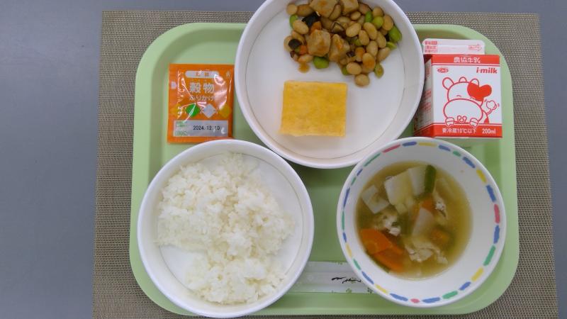 ごはん ふりかけ あつやきたまご 五目煮豆 豚汁 牛乳