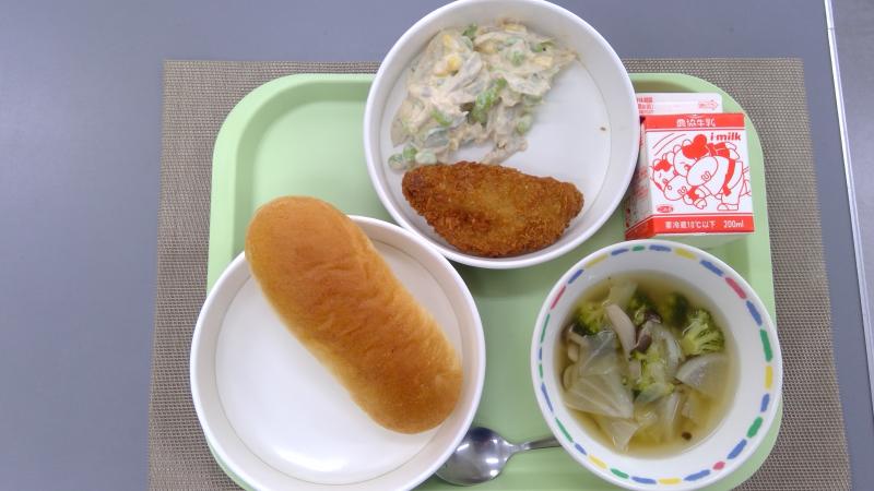コッペパン アジフライ かみかみサラダ コンソメスープ 牛乳