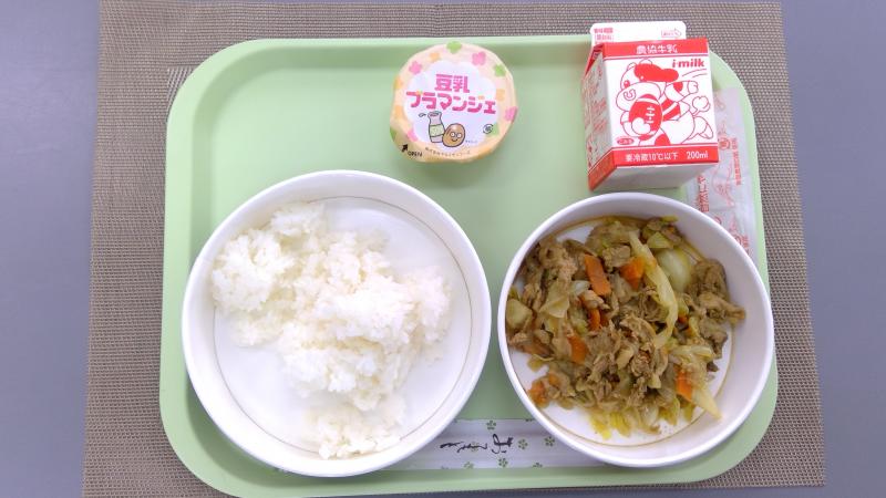ごはん 豚肉のカレーソテー 豆乳ブラマンジェ 牛乳