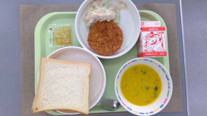 食パン リンゴジャム ハムカツ ツナサラダ かぼちゃミルクスープ 牛乳