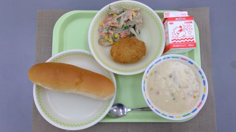コッペパン かつおカツ カミカミサラダ コーンスープ 牛乳