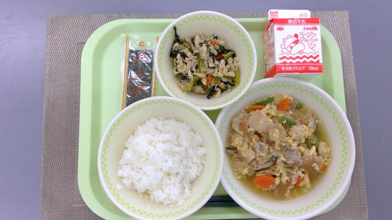 ごはん 味付けのり 車麩の卵とじ 小松菜の和風炒め 牛乳