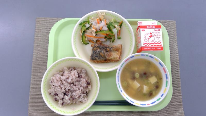 小豆飯 さごしの竜田揚げ 大根なます 納豆汁 牛乳