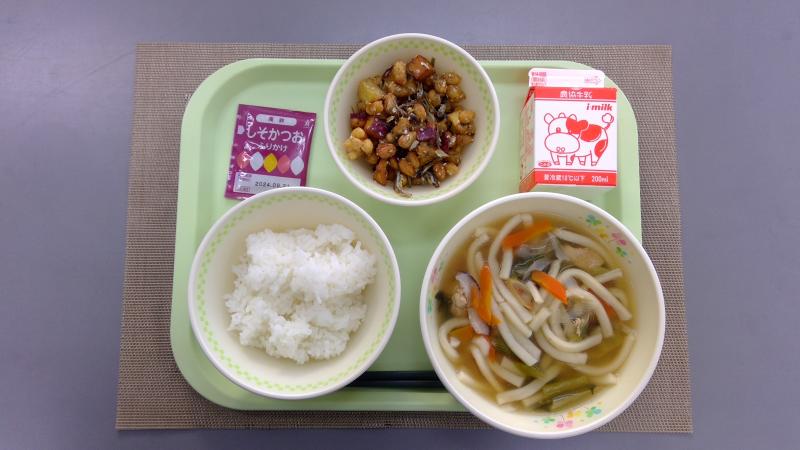 ごはん しそふりかけ かやくうどん 大豆とさつまいものごまがらめ 牛乳