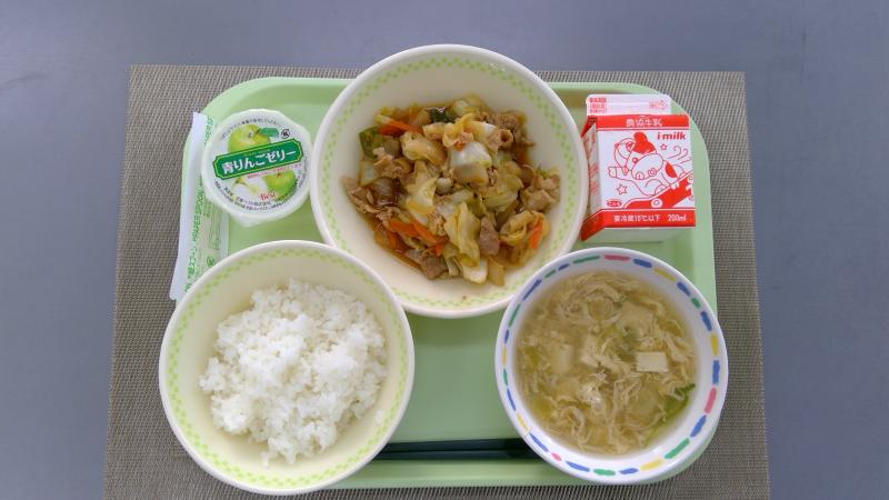 ごはん ホイコウロウ 卵スープ 青りんごゼリー 牛乳