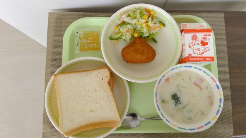 食パン リンゴジャム 栗コロッケ コールスローサラダ ミルクスープ 牛乳