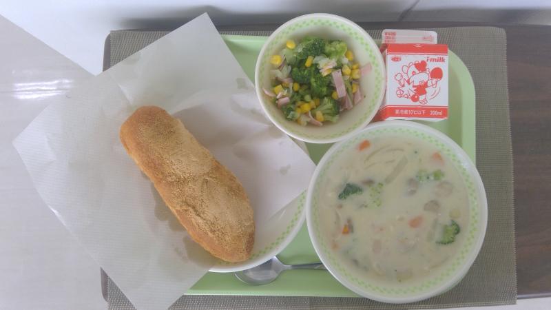 きなこ揚げパン クリームシチュー ブロッコリーサラダ 牛乳