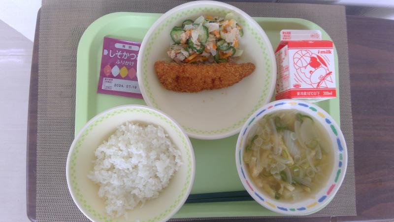 今日の和え物は暑い日もさっぱり食べれるゆかり味です。しそが苦手な生徒もいますが、しっかり食べてくれました。