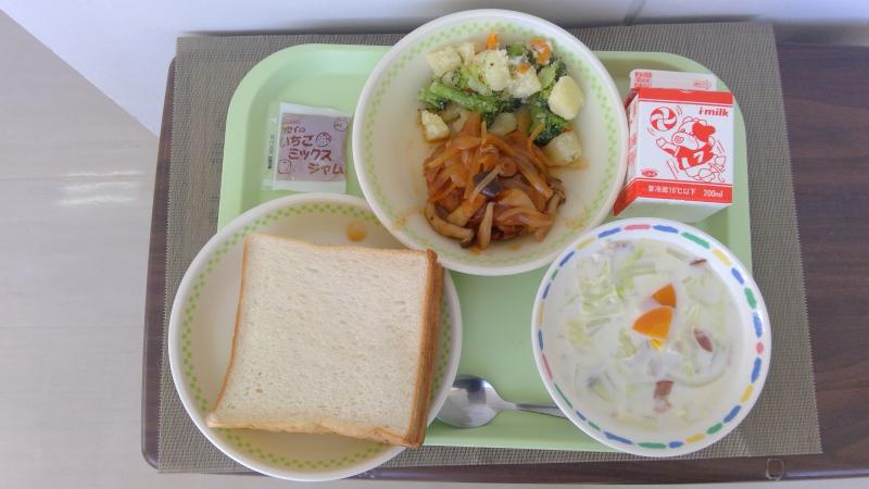 食パン いちごジャム 煮込みハンバーグ 温野菜 クラムチャウダー 牛乳