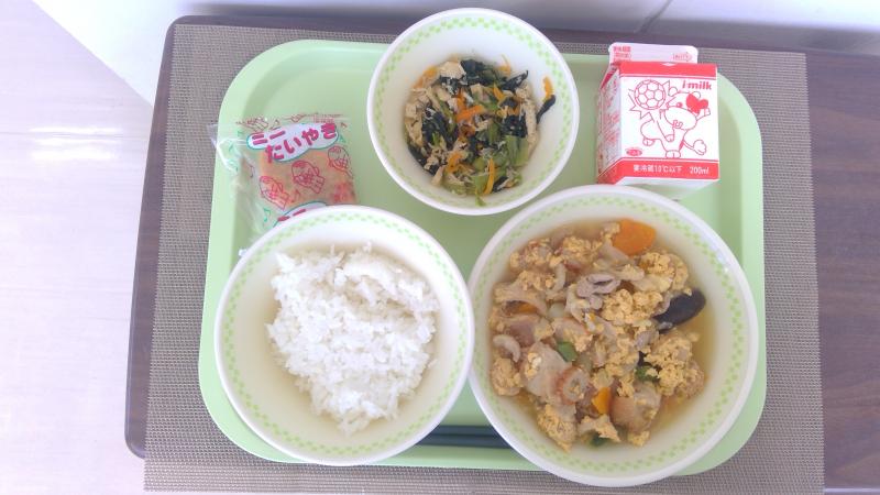 週初めには食べやすい卵とじにしてみました。デザートのたい焼きにも喜んでくれる生徒が多かったです