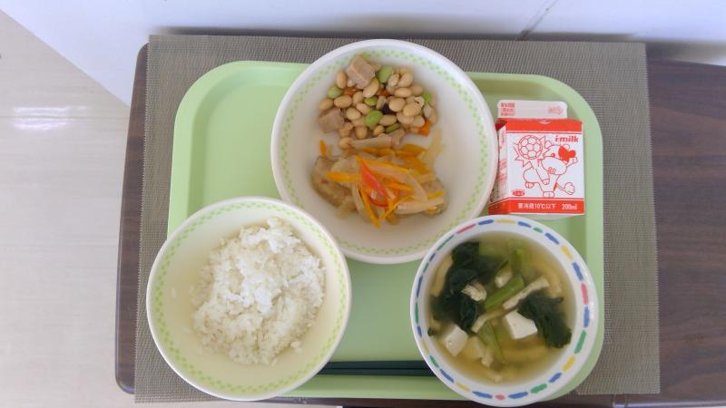 ごはん あじの南蛮漬け 大豆の五目煮 みそ汁 牛乳