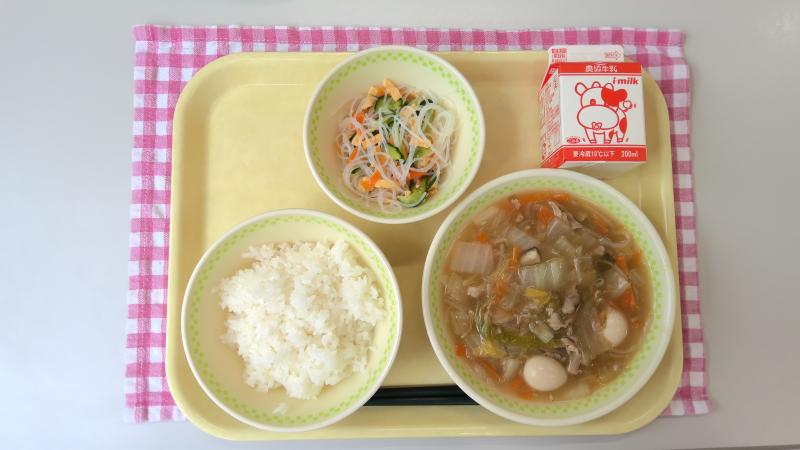 今日は八宝菜をつくりました。八宝菜の言葉の意味を知っていますか?8種類の具があるという意味ではなく、「八」は「たくさんな」という意味があるそうです。今日の給食では豚肉、はくさい、にんじん、しいたけ、もやし、たまねぎ、うずらの卵とたくさんの食材をつくってつくりました。