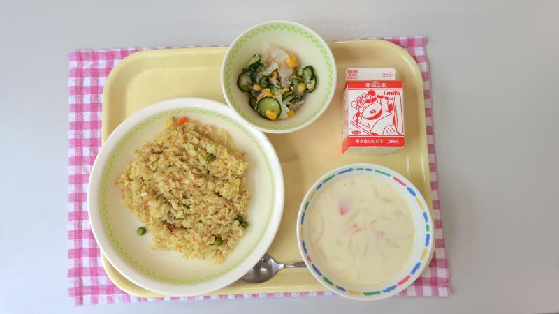 カレーピラフ ドレッシングサラダ ミルクスープ 牛乳