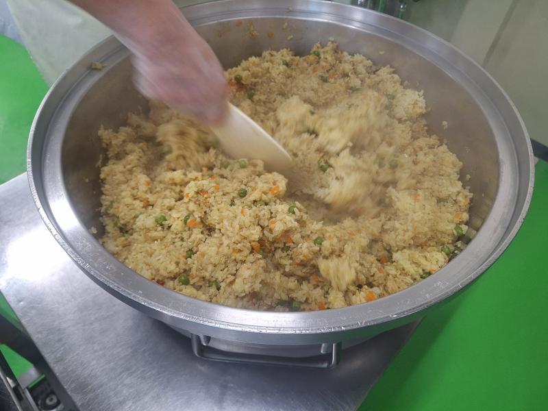 今日の主食のカレーピラフは炒めたピラフの具をカレー味に味をつけて炊いたごはんに混ぜ込んでつくっています。
