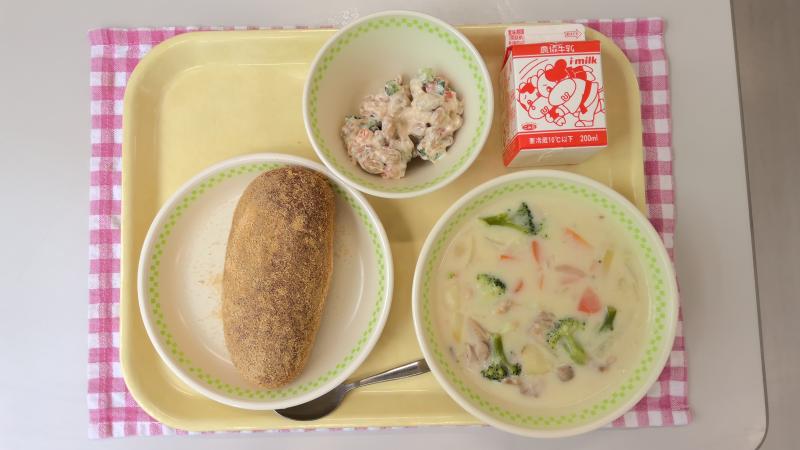 揚げパン クリームシチュー 大豆のコロコロサラダ 牛乳